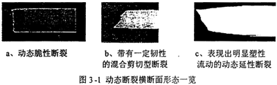 管線的工作溫度在管線鋼的DBTT以下時(shí),動(dòng)態(tài)斷裂呈現(xiàn)宏觀脆性斷裂的特征,即其橫縱向斷口都為平直的只有很少剪切唇或完全沒有剪切唇的脆性斷口。這種動(dòng)態(tài)脆性斷裂(DBF)沿著管道的對稱面發(fā)展,如圖3-1a所示。