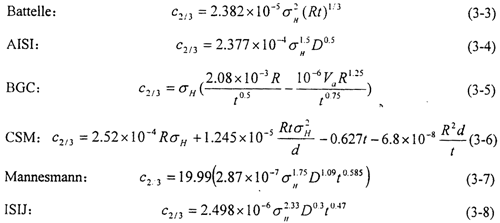 在雙曲線法的基礎(chǔ)上,結(jié)合大量的實(shí)驗(yàn)結(jié)果對止裂韌性進(jìn)行標(biāo)定,世界各大研究機(jī)構(gòu)分別給出了簡便易算的經(jīng)驗(yàn)公式用以估算臨界止裂韌性,列舉如下: