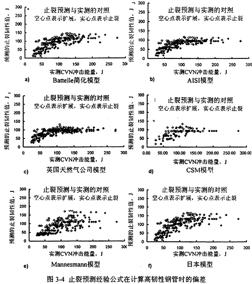 圖3-4表示了Battelle應(yīng)用Maxey雙曲線法對全尺寸實(shí)驗(yàn)數(shù)據(jù)庫所做的DDF止裂韌性預(yù)測,圖3-4a至圖3-4f分別對應(yīng)于式(3-3)至式(3-8)。圖中顯示的實(shí)驗(yàn)用管的鋼級(jí)包括X52到Xl00,管徑范圍從4O6mm到1422mm,實(shí)驗(yàn)最高壓力超過16MPa?梢,預(yù)測模型在管材韌性低于某一水平時(shí)預(yù)測結(jié)果與實(shí)物實(shí)驗(yàn)結(jié)果基本吻合,但當(dāng)管材韌性較高時(shí)出現(xiàn)明顯偏差,預(yù)測應(yīng)該止裂的管線沒有止裂。經(jīng)典的止裂預(yù)測模型在預(yù)測夏比能量值高于94J的管材時(shí),已經(jīng)偏于危險(xiǎn),即過高估計(jì)了管材的止裂性能。
