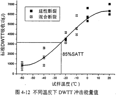與CVN實驗類似,DWTT沖擊韌性也隨溫度的升高而增加。圖4-12給出了與圖4-6相對應(yīng)的具有上臺能的控軋鋼材標(biāo)準(zhǔn)DWTT吸收功與溫度的變化關(guān)系。DWTT試樣和夏比試樣的厚度差異導(dǎo)致了兩圖85%SATT不同。