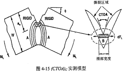 (CTOA)c可以通過攝像機(jī)從實物裂紋擴(kuò)展的照片上觀測得到,也可同CVN或DWTT實驗建立聯(lián)系。Wilkowski分別建立了基于CVN和DWTT吸收功的(CTOA)c經(jīng)驗算法,模型如圖4-15。另一種方法是通過測定作用于試件上的總功,從裂紋擴(kuò)展能的角度計算(CTOA)c。