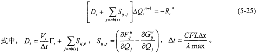 方程(5-24)可以采用顯式或隱式的方法進行求解。但是由于受時間步長的限制,采用顯式的R-K時間推進方法需要迭代的步數(shù)較多,計算很不經(jīng)濟,因此本文采用了Gauss-Seidel迭代隱式求解的方法。