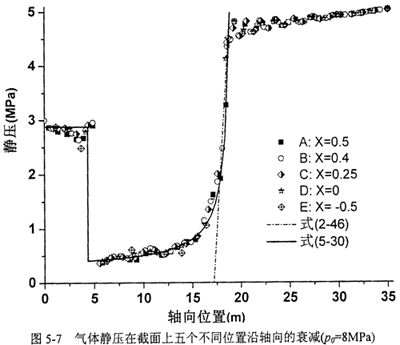 由于管道內(nèi)壁處的氣體靜壓等于該處管道承受的壓力,圖5-6和圖5-7中A-E各點沿Z向的氣體靜壓變化反映了管道承受壓力的軸向衰減規(guī)律。兩圖中的初始內(nèi)壓分別為10MPa和8MPa。