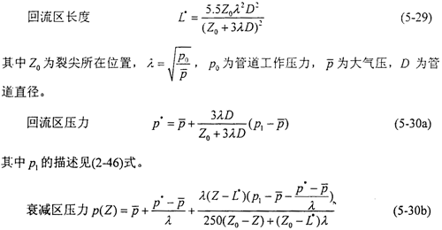 其三是衰減區(qū)的壓力變化。氣流通過裂紋尖端時,管壁上作用的氣體壓力沿軸向迅速衰減,經(jīng)驗公式(2-47)中所用的衰減長度一般取為1.5倍管道直徑,最終衰減到零。計算表明衰減長度隨管道工作壓力的升高而增加,并且衰減區(qū)壓力的最低值與管道的工作壓力相關。由于對裂紋的擴展狀態(tài)影響甚微,裂尖前部的壓力不是關心的對象。