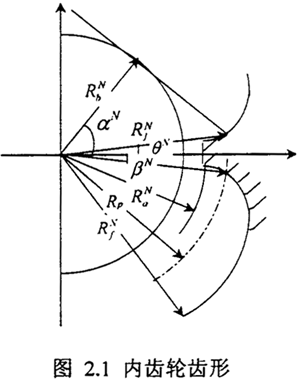 如果以齒寬心處圓心為原點(diǎn),聯(lián)軸向?yàn)閆w,以齒厚的中線為極軸,垂直于軸線方向的任意截面上的齒形如圖2.3,半徑為