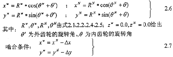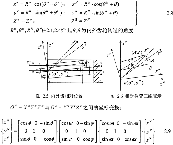 Δψ是繞YW,XW軸相對(duì)傾斜角。內(nèi)外齒輪分別經(jīng)ZN,ZW為軸線進(jìn)行旋轉(zhuǎn),其轉(zhuǎn)角分別為θ,θ′,由2.1,2.4式可以確定內(nèi)外齒各齒面的極坐標(biāo),則內(nèi)外齒齒廓在直角坐標(biāo)系中ON-XNYNZN,OW-XWYWZW的坐標(biāo)分別為: