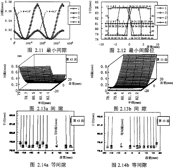不失一般性設(shè)內(nèi)齒輪為主動輪外齒輪相對內(nèi)齒輪徑向位移Δx=-0.2mm,Δy=0.無載荷的情況下計算結(jié)果:圖2.7是內(nèi)齒旋轉(zhuǎn)一周時任意一對齒的最小間隙的變化或在任意的轉(zhuǎn)角0下各齒對的最小間隙。2.8 圖是半徑方向最小間隙所在的位置,由于外齒是鼓形齒且沒有偏角,在無載荷的情況下只在齒輪的中央齒廓處嚙合所以僅畫出半徑方向最小間隙位置。圖2.7 曲線1 是用本章方法計算的結(jié)果,曲線2 是用Heinz 幾何方法計算的結(jié)果,我們可以看出用兩種方法計算最小間隙的大小非常一致,但位置不同圖2.8 ,因為Heinz 方法僅規(guī)定內(nèi)外齒在分度圓上嚙合,本文是從全齒高嚙合狀態(tài)來考慮最小間隙及其位置的。圖2.7中250° 近間隙為零,即在無載荷或輕載荷時內(nèi)外齒輪在此處附近的對齒嚙合,相應(yīng)圖2.8 在250°嚙合處的縱坐標大致為基圓的半徑,即嚙合線與基圓相切并與△x 位移線平行,這與前面所說與零齒差齒輪嚙合相似;圖2.9, 2.10 是在θ=0時第39 齒(圖a)和第13齒(圖b)的齒面間隙和等間隙曲線,從圖中可以看出最小間隙在齒寬的中央,這是因內(nèi)外齒沒有發(fā)生相對轉(zhuǎn)角位移,而且間隙沿齒高方向間隙變化的梯度小,即分度圓上的間隙與齒高方向的間隙相關(guān)很小,而沿著齒輪軸向的間隙變化的梯度較大,等間隙曲線沿軸向分布呈帶狀,這也是Heinz和本文計算最小間隙大小相近的原因。