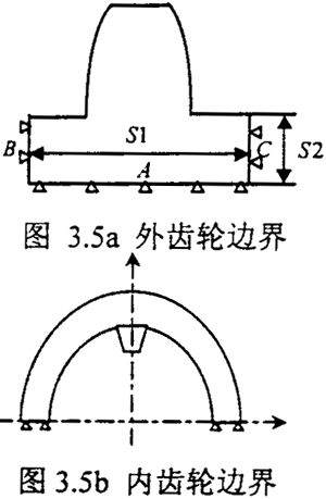 其內(nèi)齒的邊界范圍如果齒圈的厚度很薄時為了記及齒圈的變形取半個齒輪,如圖3.5b所示: