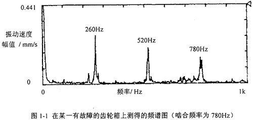 齒輪在傳動(dòng)過程中,輪齒是不斷地處在一齒與兩齒交替咬合狀態(tài),對(duì)于斜齒輪,是不斷地處在兩齒與三齒交替咬合狀態(tài)。當(dāng)齒側(cè)有間隙時(shí),此時(shí)的振動(dòng)體系是時(shí)變的非線性系統(tǒng);輪齒間隙過大時(shí)還會(huì)出現(xiàn)瞬時(shí)脫齒狀態(tài)。因此,齒輪所產(chǎn)生的振動(dòng)除了和輪齒嚙合剛度時(shí)變性有關(guān)外,還和齒輪的制造誤差(如質(zhì)量偏心、齒距偏差和齒形誤差)、裝配不良(如兩個(gè)齒輪軸心線不平行)、齒輪正常損傷(如齒輪正常磨損等)和齒輪非正常損傷(如齒面疲勞點(diǎn)蝕、齒面剝落、齒面燒傷、塑性變形和膠合撕傷等)有關(guān)。人們一般都認(rèn)為,齒輪在振動(dòng)時(shí)其振動(dòng)故障頻率為齒輪嚙合頻率的n倍(n=l,2,3,…),但實(shí)際情況并不完全如此,如在圖1-1中,齒輪振動(dòng)故障頻率為齒輪嚙合頻率的1/3、2/3和3/3倍,振動(dòng)速度的幅值也較齒輪正常時(shí)大一些;在另外一些場(chǎng)合,齒輪振動(dòng)故障頻率為n/m倍(n,m皆為正整數(shù))。因此很有必要對(duì)產(chǎn)生分?jǐn)?shù)倍亞諧和超諧振動(dòng)的原因作深入的研究工作。