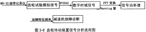 圖3-8是齒輪傳動(dòng)裝置信號(hào)分析流程圖,用HP3562動(dòng)態(tài)數(shù)字分析儀采集MR-30磁帶記錄儀紀(jì)錄的二級(jí)圓柱斜齒輪減速機(jī)試驗(yàn)過程中的模擬信號(hào),可得到齒輪傳動(dòng)裝置載荷、齒輪傳動(dòng)裝置箱體動(dòng)態(tài)激勵(lì)力應(yīng)變變化的時(shí)域信號(hào),對此信號(hào)作FFT變換,可得到載荷譜和動(dòng)態(tài)激勵(lì)力應(yīng)變變化時(shí)域信號(hào)的功率譜。為了防止功率譜泄露,在作FFT變換時(shí),需作加窗處理,由于試驗(yàn)采集的是隨機(jī)信號(hào),故加漢寧(Hanning)窗處理。利用故障診斷特征參數(shù)-傳動(dòng)零件可能發(fā)生故障的振動(dòng)頻率及其振動(dòng)頻率處的功率對試驗(yàn)信號(hào)進(jìn)行診斷分析。當(dāng)功率譜所包含的頻率成份難以區(qū)分時(shí),可采用倒譜分析。