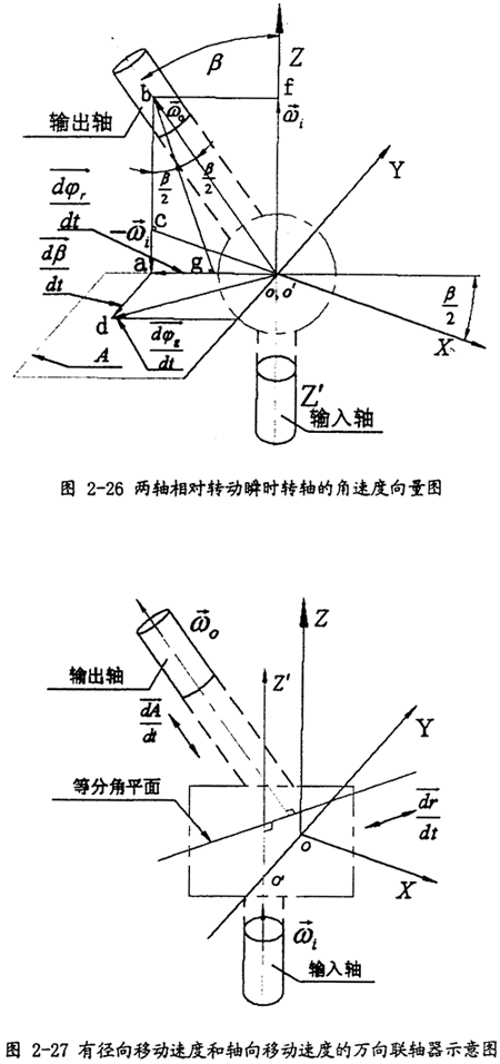 所以軸線相交的等角速萬向聯(lián)軸器輸出軸相對(duì)于輸入軸的相對(duì)轉(zhuǎn)動(dòng)瞬時(shí)轉(zhuǎn)軸始終位于兩軸的等分角平面內(nèi)?紤]到萬向聯(lián)軸器的一般情形:輸入軸與輸出軸軸線并不位于同一平面內(nèi),存在與輸入軸線和輸出軸線垂直的徑向位移,且有徑向移動(dòng)速度和軸向移動(dòng)速度