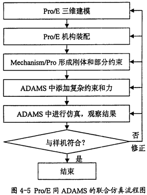 在仿真中如果發(fā)現(xiàn)結(jié)果不對,則我們需要對前面的模型進行修正,然后再做仿真分析,直到結(jié)果正確?偠灾肞ro/E和ADAMS進行聯(lián)合仿真,其基本的步驟如圖4-5所示。