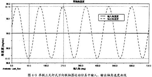 由圖4-6可知,仿真中十字軸萬向聯(lián)軸器的兩軸夾角實際上即是34.88°(原夾角的補角),在第二章的十字軸萬向聯(lián)軸器理論計算曲線圖中也包含了這個夾角下的運動分析曲線(圖2-12),比較圖2-12中β=34.88°的曲線和圖4-7的曲線,可知兩條曲線在變化頻率、形狀、值的大小都是一樣的。