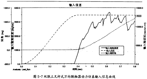 由圖5-7可以看出,雙聯(lián)三叉桿萬(wàn)向聯(lián)軸器在動(dòng)力仿真的過(guò)程中,輸入力矩逐步以STEP函數(shù)的趨勢(shì)增大,當(dāng)其克服靜摩擦力后,開始轉(zhuǎn)動(dòng),在角速度達(dá)到一定的值后,出現(xiàn)波動(dòng)的現(xiàn)象(紅色線條所示),并非如平常想象的近似等速轉(zhuǎn)動(dòng)。
