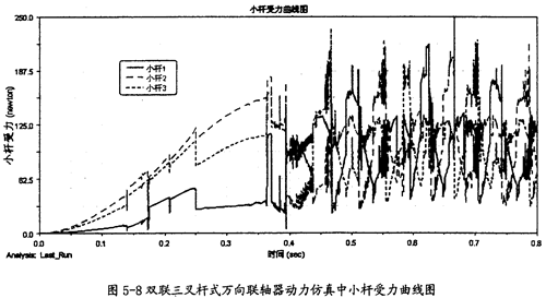 以上所有的測(cè)量結(jié)果均是在同-次仿真中得到,仿真歷時(shí)0.8秒,雙聯(lián)三叉桿式萬(wàn)向聯(lián)軸器在仿真中經(jīng)歷了從啟動(dòng)到平穩(wěn)波動(dòng)的動(dòng)態(tài)過(guò)程。在所有力的測(cè)量曲線中,曲線有突變現(xiàn)象,這-現(xiàn)象可能同模型中的剛體假設(shè),以及靜摩擦系數(shù)到動(dòng)摩擦系數(shù)和突變有關(guān),如果用柔性體代替剛體,其結(jié)果應(yīng)該會(huì)平滑。但總的來(lái)說(shuō),這里的曲線在-定的程度上反應(yīng)了這些力的變化趨勢(shì),也可以作為分析的參考。