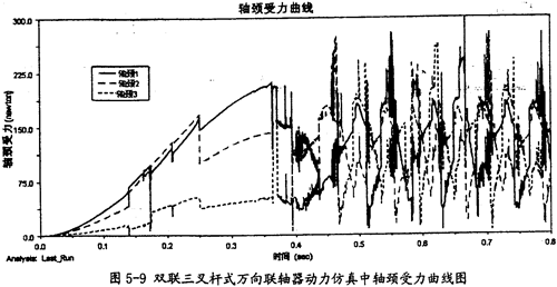 由圖5-9可以看出,雙聯(lián)三叉桿式萬(wàn)向聯(lián)軸器在動(dòng)力仿真的過(guò)程中, 雙聯(lián)三叉桿一端的三軸頸同內(nèi)球頭的圓柱副上的作用力變化趨勢(shì)同圖5-8中的小桿變化趨勢(shì)是相同的。由于它們的受力變動(dòng)復(fù)雜,故這三力在雙聯(lián)三叉桿一端上的向量和也可能不為0。這樣在雙聯(lián)三叉桿上也會(huì)產(chǎn)生附加彎矩的作用。而且軸頸受力平均較小桿的受力要大。