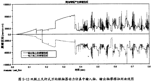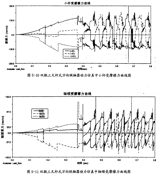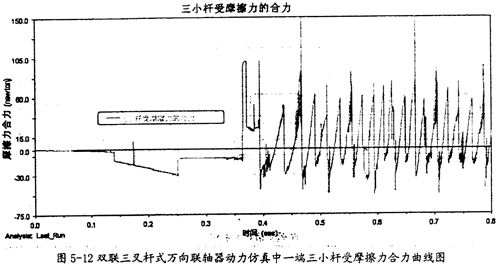由圖5-12可以看出,雙聯(lián)三叉桿式萬(wàn)向聯(lián)軸器在動(dòng)力仿真的過(guò)程中,其一端的三個(gè)小桿所受的摩擦力的合力變動(dòng)較有規(guī)律,其值在開始一段平滑,其后幾乎以0為中心波動(dòng)。由于這三個(gè)摩擦力的方向均平行于輸入軸或輸出軸軸線,故此合力會(huì)在輸入軸和軸出軸上產(chǎn)生軸向的力,在輸入軸和輸出軸上產(chǎn)生摩擦扭矩。如取其水平較高值60牛來(lái)計(jì)算,它產(chǎn)生的摩擦扭矩為270N·mm(60×0.3×15=270,其中0.3為動(dòng)摩擦系數(shù),15為摩擦半徑),此值相對(duì)圖5-13中的值而言相當(dāng)小。