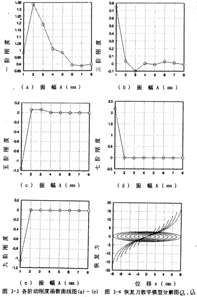 將(3-27)式中剛度函數(shù)作成曲線(xiàn)如圖3-3(a)-(e)所示,由一階動(dòng)剛度函數(shù)圖3-3(a)可知,振幅在lmm~2mm范圍內(nèi)時(shí),動(dòng)剛度隨振幅增大而增大,呈硬特性;當(dāng)振幅在2mm~7mm范圍內(nèi)時(shí),動(dòng)剛度隨振幅增大而減小,呈軟特性;當(dāng)振幅在7mm~8mm范圍時(shí),動(dòng)剛度隨振幅增大略有回升。由此圖可知,在聯(lián)軸器初始小振幅和極限振幅附近范圍內(nèi),動(dòng)剛度呈硬特性,而在中間振幅范圍內(nèi)呈軟特性。K5(A)和K9(A)也具有類(lèi)似的特性。而K3(A)和K7(A)在小振幅時(shí)呈軟特性,這樣的動(dòng)剛度特性滿(mǎn)足船舶緩沖減振降噪的要求,即在一般低能量風(fēng)浪流作用下,該聯(lián)軸器鋼絲繩元件的變形小,動(dòng)剛度大,呈硬特性,這能保證船舶推進(jìn)軸系的基頻高于風(fēng)浪流的顯著能量頻率;在大能量風(fēng)浪流和沖擊作用下時(shí),聯(lián)軸器由于載荷增大而變形增大,這種情況下動(dòng)剛度軟化,使船舶推進(jìn)軸系頻率變小,向遠(yuǎn)離大能量風(fēng)浪流和沖擊顯著能量頻率一側(cè)偏移,在遲滯阻尼下耗散能量,使軸系沖擊振動(dòng)響應(yīng)降低。由(3-27)式和(3-12)式可作出相應(yīng)的彈性恢復(fù)力單值曲線(xiàn)如圖3-4所示。將圖3-4中代表彈性恢復(fù)力的單值曲線(xiàn)與圖3-2中的單值曲線(xiàn)比較可知,(3-12)式能較好地描述聯(lián)軸器彈性恢復(fù)力隨振幅變化的規(guī)律。