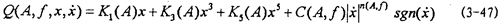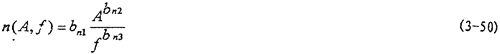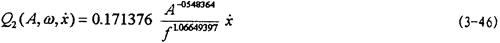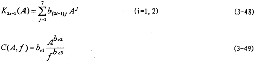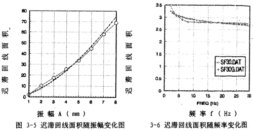 的函數(shù),或者說(shuō)恢復(fù)力Q是剛度函數(shù)K1(A),K3(A),K5(A)和阻尼函數(shù)C(A,f)以及阻尼成分函數(shù)n(A,f)的函數(shù),其中阻尼成分函數(shù)n(A,f)描述阻尼的組成情況,n(A,f)=0時(shí),阻尼為干摩擦阻尼,n(A,f)=1時(shí),為粘性阻尼,0<n(A,f)<1時(shí),阻尼由粘性阻尼和干摩擦阻尼組成,n(A,f)>1時(shí),阻尼成為“高階”阻尼。對(duì)于(3-47)式,當(dāng)振幅與頻率一定時(shí),式中的Kl(A),K3(A),K5(A)和n(A,f)均為定數(shù),當(dāng)振幅A和頻率變化時(shí),它們均是函數(shù),因此參數(shù)辨識(shí)實(shí)質(zhì)上是參數(shù)函數(shù)的辨識(shí)。首先我們用非線性參數(shù)辨識(shí)方法Marquardt法,根據(jù)試驗(yàn)所得的數(shù)據(jù),按照(3-47)式對(duì)每一遲滯回線進(jìn)行參數(shù)辨識(shí),可以得到對(duì)應(yīng)的K1(A),K3(A),K5(A),C(A,f)和n(A,f)值,對(duì)每種工況下的數(shù)據(jù)隨振幅和頻率變化趨勢(shì)進(jìn)行分析后,可以建立剛度函數(shù)、阻尼函數(shù)和阻尼成份函數(shù)的數(shù)學(xué)表達(dá)式為:
