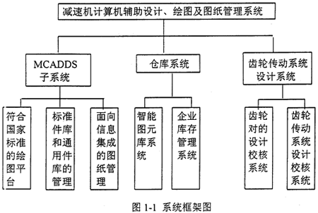 減速機(jī)計(jì)算機(jī)輔助設(shè)計(jì)、繪圖及圖紙管理系統(tǒng)主要包括MCADDS子系統(tǒng)和齒輪傳動(dòng)系統(tǒng)的設(shè)計(jì)系統(tǒng)和信息管理系統(tǒng)三部分(見(jiàn)圖1-1),其中MCADDS子系統(tǒng)實(shí)現(xiàn)高效繪圖;齒輪傳動(dòng)系統(tǒng)的設(shè)計(jì)系統(tǒng)快速精確的實(shí)現(xiàn)產(chǎn)品設(shè)計(jì);而信息管理系統(tǒng)將提高企業(yè)的信息管理與控制,提高資源利用率。