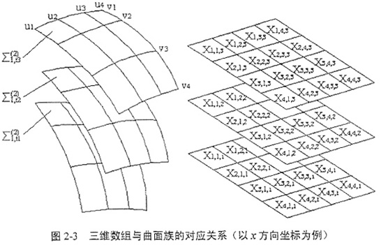 若已知曲面Σ1由一系列離散的坐標(biāo)值表示,則規(guī)則化后的坐標(biāo)值系列可以寫成二維數(shù)組成的形式,二維數(shù)組中的各維分別對應(yīng)u,v參變量或方向,二維數(shù)組中的各元素分別對應(yīng)曲面上節(jié)點(diǎn)的坐標(biāo);那么,曲面Σ1在坐標(biāo)S2中運(yùn)動形成的曲面族{Σ1}可以用三維數(shù)組表示,三維數(shù)組的各維分別對應(yīng)u,v,t參變量或方向,并且曲面族中的各點(diǎn)與此三維數(shù)組的各個元素在空間結(jié)構(gòu)上是——對應(yīng)的,如圖2-3所示。