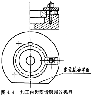 內(nèi)齒圈齒廓的數(shù)控加工,是在齒圈外徑及兩端面都精加工后進(jìn)行的,因此,應(yīng)以端面及外徑作為定位基準(zhǔn)。其夾具可做成螺釘壓板結(jié)構(gòu),如圖4.4所示。夾具內(nèi)徑應(yīng)盡量接近齒圈外徑,用千分表以夾具內(nèi)圓為基準(zhǔn)找正工作臺(tái)軸心。