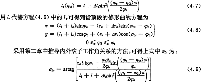由方程式(2.21)表示的內(nèi)齒圈齒廓是無側(cè)隙的,即圓周上所有的推桿,不論是否處于工作狀態(tài),都是和內(nèi)齒圈齒廓相接觸的。為了使推桿減速器便于裝拆和保證良好的潤滑,實(shí)際的推桿減速器不能采用這種無隙嚙合的理論齒廓,而應(yīng)采用有隙嚙合的修形齒廓。修形齒廓就是有意識(shí)地將理論齒廓進(jìn)行微量修削后所得到的齒廓。對(duì)齒廓修形除了給嚙合傳動(dòng)留有一定量的間隙外,更重要的是使傳動(dòng)性能得到改善。所以修形齒廓的形狀和參數(shù)是內(nèi)齒圈齒廓加工的一個(gè)重要問題。