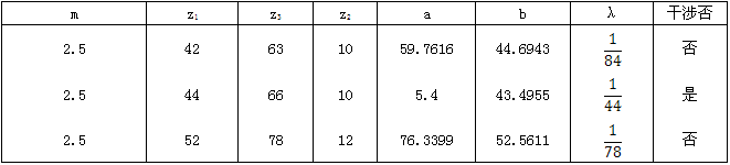 從(6.37)、(6.38)、(6.43)三式所組成的方程組中,解出a、b及z2,將齒數(shù)代入( 6.40)便得到臨近發(fā)生運(yùn)動干涉時的λ值。因為z2是整數(shù),當(dāng)m給定后,由上面三個式子所組成的方程組一般是無解的。若把m也作為一個參變數(shù),這時方程有解。
