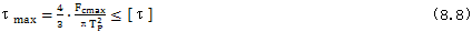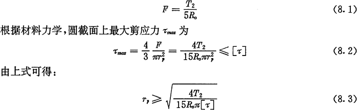 將上述所得基本設(shè)計參數(shù)的值代入式(7.70)并求最大值可得Fcmax=1082.5(N),將其代入式(8.8)得τmax=28.69(N/mm2),小于所選軸銷的許用接觸應力,故滿足設(shè)計要求。