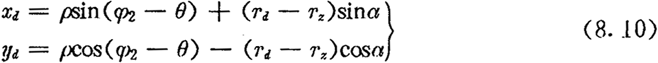 在數(shù)控加工過程中,表8.1中極徑ρd的變化是由刀具在x軸上的移動來實現(xiàn)的,而極角θd的變化是由丙齒圈隨工作臺的轉(zhuǎn)動來實現(xiàn)的,設(shè)某兩點間極徑ρd的變化量為△ρd,相應的極角變化量為△θd,則應向x軸發(fā)的脈沖數(shù)nx可按式(4.4)計算,向C軸發(fā)的脈沖數(shù)nc按式(4.5)計算。