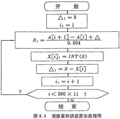 用式(4.4)及式(4.5)計算nx和nc時,得到的不可能恰好是整數(shù),為了消除累積誤差,每段中應把上一段的誤差考慮進去。例如對nx的計算,假定表8.1中ρd的360×11個數(shù)已存在數(shù)組A中,計算后的360×11-l個脈沖數(shù)nx存在數(shù)組x中,則計算過程如圖8.3所示。