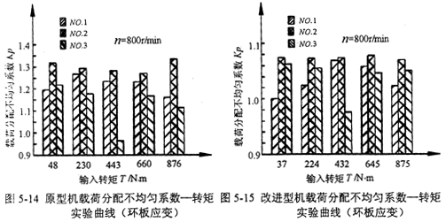 對(duì)于加裝均載裝置的改進(jìn)型機(jī),從實(shí)驗(yàn)曲線中可以看出,當(dāng)輸入轉(zhuǎn)速為75Or/min和1O00r/min時(shí),改進(jìn)型機(jī)傳動(dòng)總效率隨輸出轉(zhuǎn)矩、輸入轉(zhuǎn)速的增加而增加;在輸入轉(zhuǎn)速為1000r/min時(shí),當(dāng)輸入轉(zhuǎn)矩超過95ON·m時(shí),傳動(dòng)效率隨輸出轉(zhuǎn)矩的增加反而下降;當(dāng)輸入轉(zhuǎn)速為15O0r/min時(shí),低輸出轉(zhuǎn)矩時(shí),傳動(dòng)效率較低;隨著輸出轉(zhuǎn)矩的增加,傳動(dòng)效率明顯增高。測(cè)得的改進(jìn)型機(jī)最高效率可達(dá)92.9%。