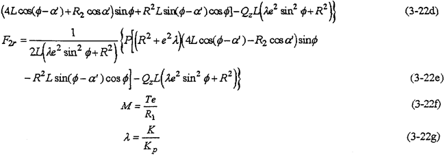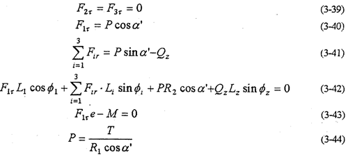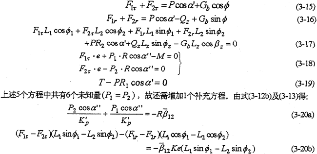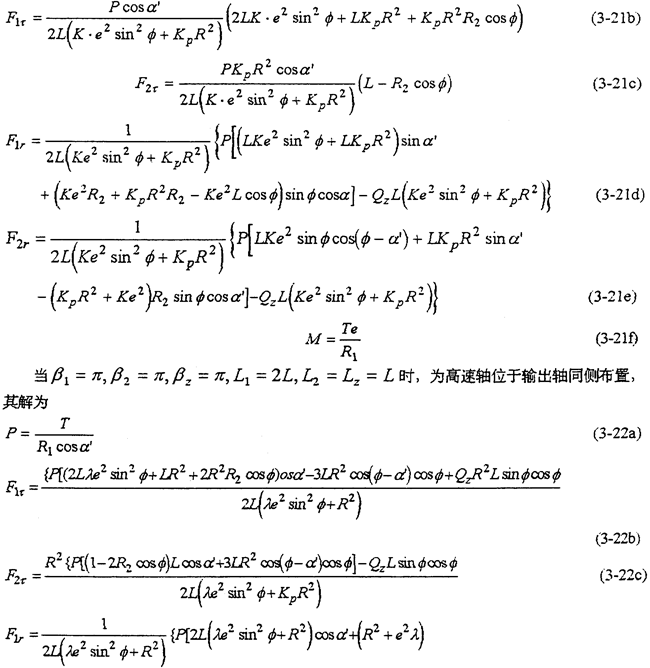 由方程式(3-15)~(3-19)和(3-20)可以完全確定雙軸輸入式的一齒環(huán)內(nèi)齒行星傳動機構(gòu)的動力參數(shù)。各動力參數(shù)中除嚙合力只與負載大小有關(guān)外,其余載荷均與傳動機構(gòu)的幾何參數(shù)L1,L2,β1,β2,R1,R2,α′,α″等因素有關(guān)。故可以通過調(diào)整這些參數(shù),以達到滿足結(jié)構(gòu)、載荷要求。