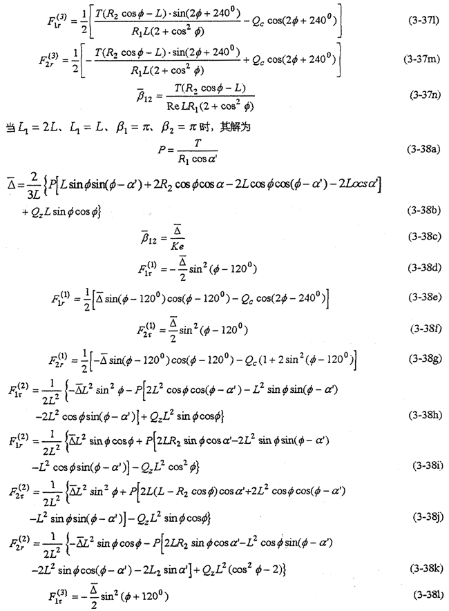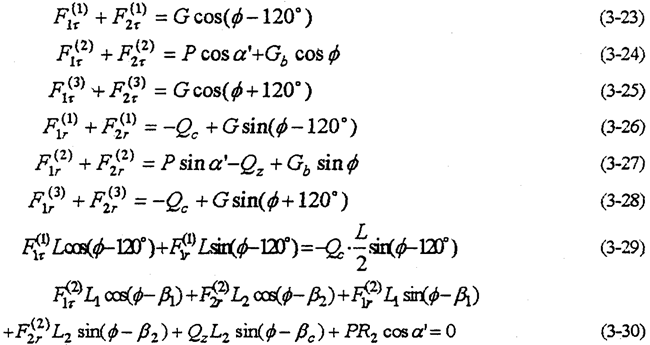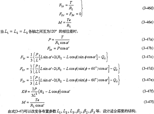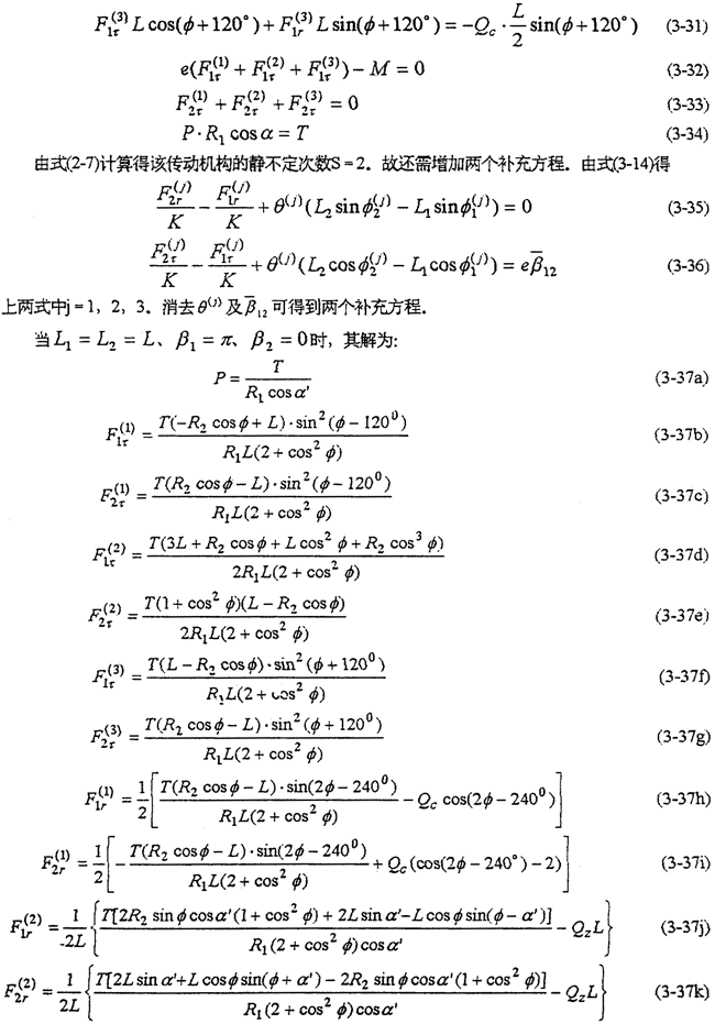 以三相并列雙曲柄機構(gòu)一齒環(huán)內(nèi)齒行星傳動機構(gòu)為例(見圖1-3圖3-3),帶行星齒板的雙曲柄機構(gòu)與另外兩套雙曲柄機構(gòu)相位差互為120°。疫帶行星齒板轉(zhuǎn)動的相位角為φ,則另兩相雙曲本機構(gòu)的相位角為φ-120°及φ+120°由動力分析基本方程,取P(1)=P(3)=0,P(j)=P得