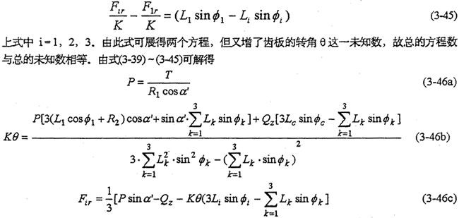 該機構(gòu)的靜不定次數(shù)S=1,故需增加一個補充方程,才能完全確定機構(gòu)的各動力參數(shù)。由齒板位移協(xié)調(diào)方程式(3-14)得