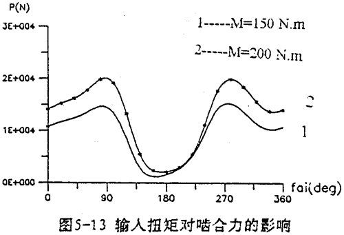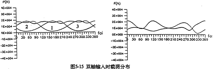 由上式可知,當(dāng)減速器幾何參數(shù)一確定,e及r2均為已知參數(shù)。因此增大M,必須引起左邊的行星軸承載荷F(j)Lx,F(xiàn)(j)1y增大使方程式(5-30)平衡。圖5-13是輸入扭矩分別為150N.m及200N.m時(shí)的嚙合圖。由圖可看出,負(fù)載增加,嚙合力幅值增大。采用雙軸輸入時(shí)可降低各載荷的幅值,使其均衡化。圖5-14是單軸輸入時(shí)的嚙合力及行星軸承載荷。圖5-15是雙軸輸入時(shí)的嚙合力及行星軸承載荷。從兩圖比較得知,無論是嚙合力,還是軸承載荷,采用雙軸輸入后其變化均趨于平緩,幅值降低很多,三相嚙合力趨于均衡,而且負(fù)向嚙合力已消除。