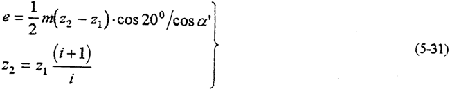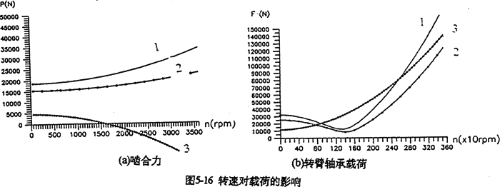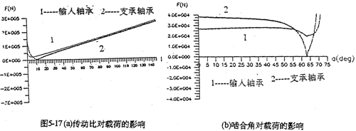由上式知,當(dāng)齒數(shù)差Z2-Z1越小或傳動(dòng)比i越大時(shí),偏心距e越小;壓力角越大時(shí),偏心距e越大,則選用的行星軸承尺寸大,齒板高速軸承孔徑也就大。圖5-17是傳動(dòng)比、壓力角、以減速器行星軸承載荷的影響。由圖可見,傳動(dòng)比的變化對(duì)減速器的動(dòng)力性能影響極大;傳動(dòng)比越大,則偏心距越小。由式(5-30)分析得,行星軸承載荷必須大。壓力角的變化,對(duì)行星軸承載荷影響小得多。
