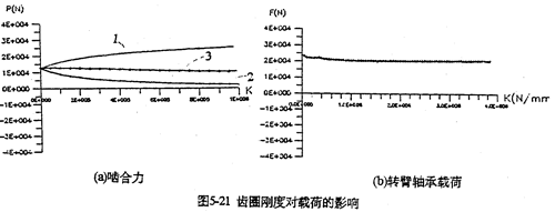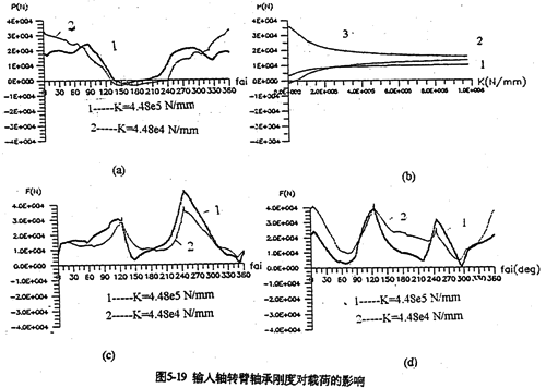 只考慮行星軸承變形及齒板變形時(shí),影響三環(huán)減速器載荷特性的剛度,主要是行星軸承剛度、和內(nèi)齒圈的變形剛度。軸承剛度與軸承材料、間隙、油膜等很多因素有關(guān)。圖5-19是輸入軸行星軸承剛度對(duì)嚙合力及行星軸承載荷的影響。當(dāng)輸入行星軸承剛度小一個(gè)數(shù)量級(jí)時(shí),負(fù)向嚙合力區(qū)域增大(見圖5-19a);隨剛度減小、各相嚙合力越不均恒(圖5-19b),輸入軸行星軸承剛度的影響比輸入軸行星軸承剛度更大,見圖5-20所示。嚙合力及各行星軸承載荷在軸承剛度較小的情況時(shí),都出現(xiàn)正常載荷的10倍以上的沖擊現(xiàn)象,沖擊產(chǎn)生的位置隨剛度變化不同。內(nèi)齒圈剛度對(duì)載荷的影響與行星軸承剛度相反(見圖5-21所錄)。當(dāng)剛度越小時(shí),三相齒板的嚙合力越均恒(見圖5-21a),而且行星軸承載荷幅值基本上不變(見圖5-21b)。同此可推知,減小三環(huán)減速器振動(dòng)的途徑之一就是提高行星軸承剛度,減小內(nèi)齒圈剛度。這可以通過對(duì)行星軸承進(jìn)行預(yù)緊,和采用軟齒面或大柔度齒圈的辦法,以使嚙合力和行星軸承載荷均衡化,以達(dá)到減振降噪的目的。