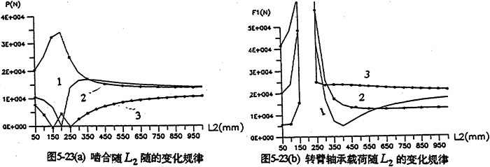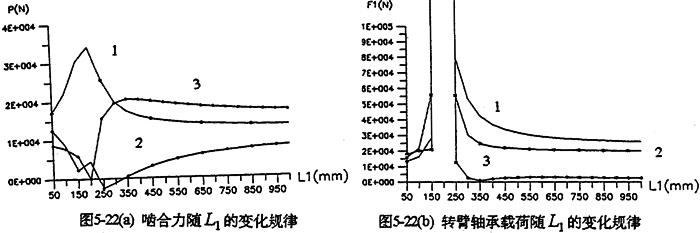 各軸水平布置時(shí),軸間的中心距變化,將引起各載荷大小幅值、規(guī)律均發(fā)生變化。圖5-22是輸入軸相對(duì)輸出軸位置變化時(shí),減速器的嚙合力及軸承載荷變化情況。由圖可知,當(dāng)輸入軸與支承軸中心距(L2=200mm)很小時(shí),三齒板的嚙合力分配很不均衡,隨著L1的增加嚙合力趨于均衡(見圖5-22a)。行星軸承載荷變化情況見圖5-22b所示。