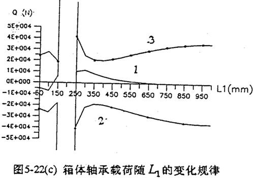 當(dāng)|L1-L2|≤50mm時(shí),載荷產(chǎn)生沖擊為無窮大,L1≥400mm以后,隨著L1的增加,三相行星軸承載荷幅值變化很緩慢,接近于直線分布。但箱體軸承載荷的幅值在L1>350mm后,隨L1增加各相之間的幅值差變大,趨于不均衡狀態(tài)(見圖5-22c)。因此SHQ50型及SHQ63型的三環(huán)減速器的振動(dòng)比SHQ40型的大。