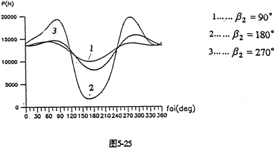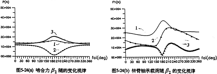 當(dāng)輸入軸與軸出軸的中心距確定后,可通過調(diào)整支承軸的位置,滿足特殊的空間位置要求,或者設(shè)計(jì)成載荷分布特性最優(yōu)、幅值最小的減速器。圖5-24是中心距L1=400mm、L2=200mm時(shí),支承軸相對(duì)于輸出軸轉(zhuǎn)動(dòng)的角位移β2變化時(shí)嚙合力及行星軸承載荷的分布情況。由圖看出,各種載荷均在180°附近(SHQ偏置式減速器)取得極大值。在0°~90°和270°~360°范圍(Ⅰ、Ⅳ限內(nèi)),三相齒板嚙合力分配很均衡,嚙合沖擊很小。因此。設(shè)計(jì)三環(huán)減速器時(shí),為減小載荷的幅值和各相之間載荷的差值、支承軸應(yīng)盡可能遠(yuǎn)離180°,即不采用三軸心共線的水平位置的結(jié)構(gòu)。圖5-25為幾個(gè)特殊位置的嚙合力隨轉(zhuǎn)角變化的分布規(guī)律。
