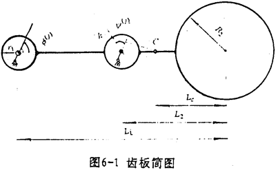 齒板簡(jiǎn)圖如圖6-1所示。以齒板支承軸孔與偏心套的接觸點(diǎn)為參考點(diǎn),則齒板質(zhì)心的位移為
