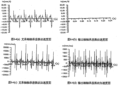 輸出軸軸顧座的振動(dòng)速度及加速度都比支承軸或輸入軸軸承座的小10倍左右,其最大值為