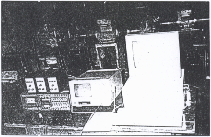 實(shí)驗(yàn)時(shí),通過控制臺(tái)操縱,交直流機(jī)組1發(fā)出直流電壓設(shè)直流測(cè)功機(jī)1按恒定轉(zhuǎn)速帶動(dòng)整個(gè)傳動(dòng)系統(tǒng)運(yùn)轉(zhuǎn)。SHQ-2及汽車變速箱將被測(cè)試件SHQ-1輸出的轉(zhuǎn)速升高后驅(qū)動(dòng)直流測(cè)功機(jī)2發(fā)出直流電流,該電流經(jīng)交直流機(jī)組2逆變?yōu)楣ゎl交流電返回電網(wǎng),完成整個(gè)電功率封閉傳動(dòng)鏈。控制參通過控制交直流機(jī)組電壓、電流、改變傳動(dòng)系統(tǒng)的轉(zhuǎn)速轉(zhuǎn)矩大小。被測(cè)信號(hào)由加速度傳感器提取,經(jīng)由電荷放大器放大后,進(jìn)入磁帶記錄儀及CF-355頻譜分析儀進(jìn)行分析計(jì)算。電功率流封齒輪傳動(dòng)實(shí)驗(yàn)臺(tái)如圖6-9所示。