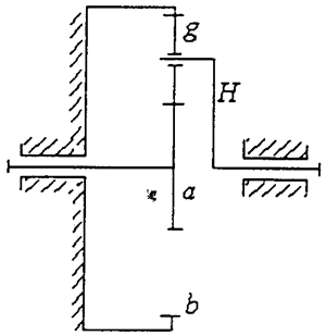 平行軸擺線針輪的基本原理是K-H少齒差行星齒輪傳動原理,見圖2.4,它應(yīng)用2.1中結(jié)構(gòu)形式,將平行雙曲柄四桿機構(gòu)的曲柄,α是連桿內(nèi)齒輪,b是定軸輸出外齒輪。其傳動比為: