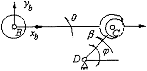 上式中,(xb,yb)是B處的位移量,θ為連桿繞鉸點(diǎn)的轉(zhuǎn)角位移,β為接觸點(diǎn)C在從動(dòng)曲柄軸上繞軸線(D)的轉(zhuǎn)角位移,L為連桿的長(zhǎng)度,見圖3.2。