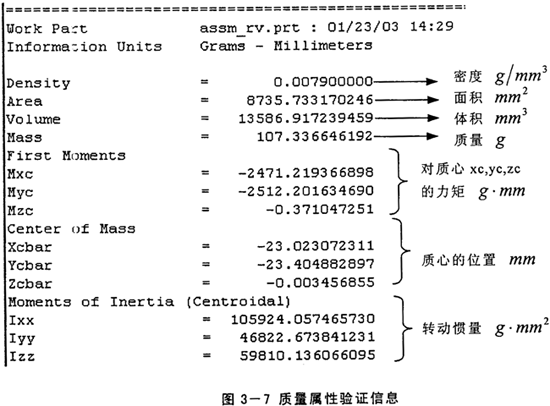 通過(guò)UG強(qiáng)大的質(zhì)量屬性檢驗(yàn)功能,可獲得每個(gè)零件及整個(gè)模型的密度、體積、質(zhì)量和慣量等必要信息。上圖3-7是所獲得的擺線輪的相關(guān)信息。