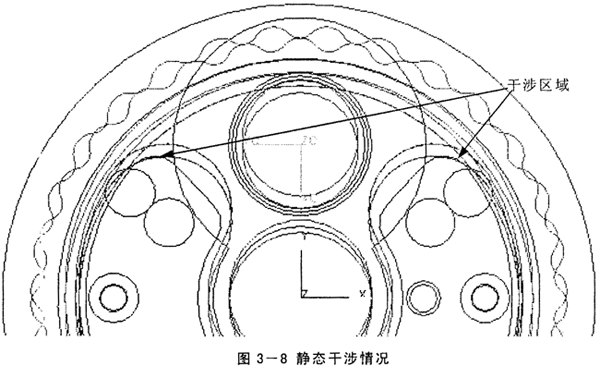 后三種都是實(shí)際結(jié)構(gòu)可能存在的,當(dāng)出現(xiàn)第一種干涉即硬干涉時(shí)就要引起高度重視,這可能是:設(shè)計(jì)存在問(wèn)題,必須及時(shí)糾正。就是借助此功能,造型完成后,本人發(fā)現(xiàn)輸出盤與擺紅、輪間有硬干涉(見(jiàn)圖3-8),與設(shè)計(jì)此減速器的部門交換意見(jiàn),原來(lái)他們?cè)谠O(shè)計(jì)完后沒(méi)有發(fā)現(xiàn)此問(wèn)題,等制造出成品后才發(fā)現(xiàn),便通過(guò)手工磨削將干涉部分除去。此處也充分體現(xiàn)了與傳統(tǒng)的設(shè)計(jì)方法相比,虛擬樣機(jī)技術(shù)有著不可比擬的優(yōu)越,即在制造第一臺(tái)物理樣機(jī)前就發(fā)現(xiàn)了機(jī)構(gòu)在結(jié)構(gòu)方面的缺陷。至于機(jī)構(gòu)的優(yōu)化和性能改進(jìn)方面,通過(guò)后面的仿真分析更能清楚地展現(xiàn)虛擬樣機(jī)技術(shù)的優(yōu)越。