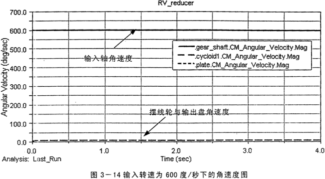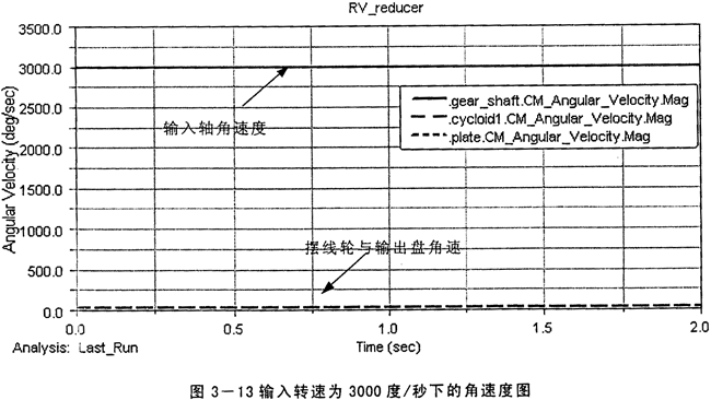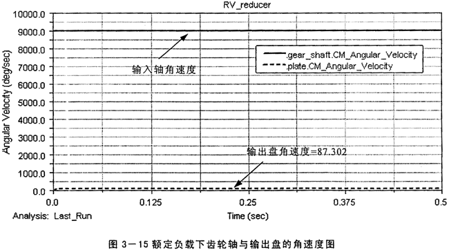按RV減速器傳動(dòng)比的理論計(jì)算公式i16=1+(z2/z1)Z7,由村課題所研究的RV減速器的參數(shù):Z2=34,Z1=10,Z7=30,計(jì)算得到總的傳動(dòng)比為103,而由仿真得到的傳動(dòng)比在圖3-8中為i=3000/29.12=103.02,在圖3-9中為i=600/5.829=102.93,且圖中擺線輪與輸出盤的角速度相等說(shuō)明輸出部分施加的約束滿足等角速度輸出原理。