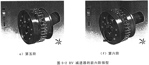 對(duì)上圖有限元模型進(jìn)行模態(tài)計(jì)算時(shí)不必求出全部的固有頻率和振型,越是低價(jià)模態(tài),對(duì)振動(dòng)影響越大,通常取前5~10階模態(tài),精度就已足夠。本課題在分析中求解了前11階模態(tài),這些模態(tài)的固頻率和振型情況見表5-1,圖5-2僅給出減速器的前6階固有振型,通過振型圖和各階振型的動(dòng)畫顯示,可直觀地分析RV減速器的動(dòng)態(tài)特性。